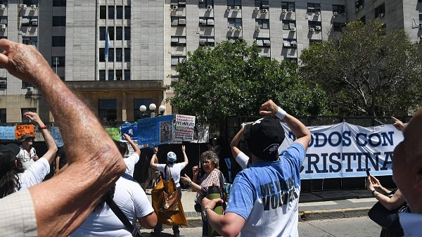 Manifestantes autoconvocados y de agrupaciones políticas y sociales se concentraron este marrtes a la tarde frente a los Tribunales Federales de Comodoro Py para expresar su respaldo a la vicepresidenta Cristina Fernández de Kirchner y en repudio al fallo del Tribunal Oral Federal 2 que condenó a la exmandataria a 6 años de prisión e inhabilitación especial perpetua para ejercer cargos públicos por administración fraudulenta en perjuicio del erario público con la obra pública en Santa Cruz.