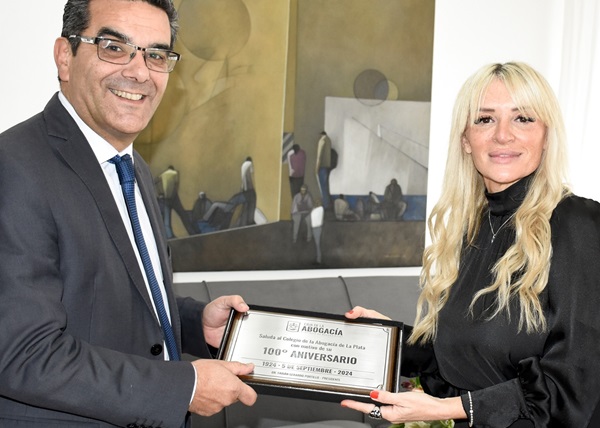 En el marco de los festejos por los 100 años del Colegio de la Abogacía de La Plata, el Presidente de esta Caja de la Abogacía de la provincia Dr. Fabián Portillo hizo entrega de una placa institucional de salutación a la Dra. Marina Mongiardino, Presidenta del CALP.