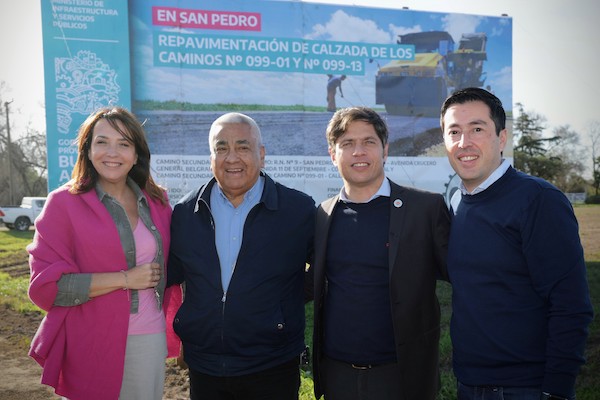 El gobernador de la provincia de Buenos Aires, Axel Kicillof recorrió este viernes los avances de la obra de pavimentación de la ruta provincial Nº1.001 en el municipio de San Pedro junto al intendente local, Cecilio Salazar; el ministro de Infraestructura y Servicios Públicos, Leonardo Nardini; y la diputada provincial, Natalia Sánchez Jáuregui.