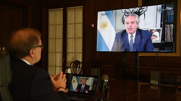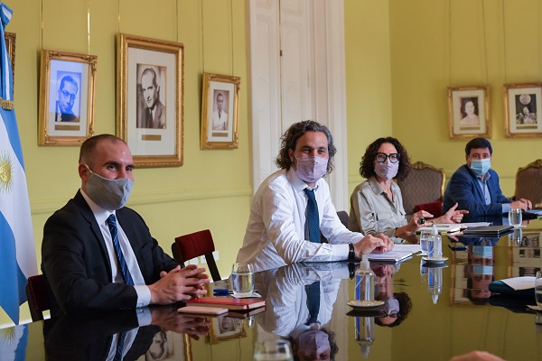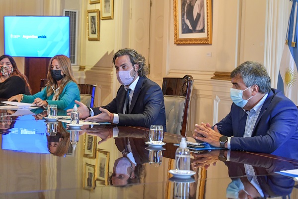El jefe de Gabinete de Ministros de la Nación, Santiago Cafiero; la presidenta del Consejo Nacional de Políticas Sociales, Victoria Tolosa Paz; el presidente del ENACOM, Claudio Ambrosini y la secretaria de Innovación Pública, Micaela Sánchez Malcolm; junto a representantes de las compañías de telecomunicaciones, se reunieron este mediodía en el salón Eva Perón de la Casa Rosada.