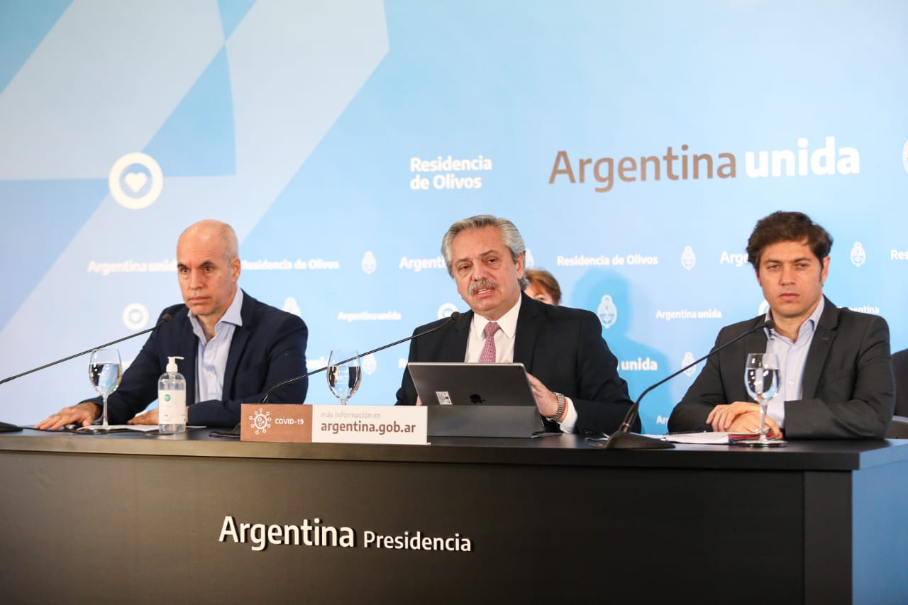El Presidente realiza anuncios con respecto al futuro del aislamiento social, en el marco de la pandemia originada por el Covid-19. Lo acompañan el gobernador de la provincia de Buenos Aires, Axel Kicillof, y el jefe de Gobierno poteño, Horacio Rodríguez Larreta.