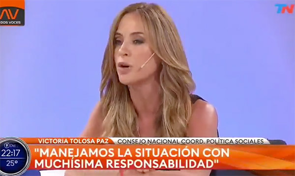 La titular del Consejo Nacional de Coordinación de Políticas Sociales y concejala platense, Victoria Tolosa Paz, sostuvo que “el Presidente (Alberto Fernández) consensuó cada una de las acciones de pandemia con los gobernadores de Cambiemos y el Jefe de Gobierno de la Ciudad de Buenos Aires”.