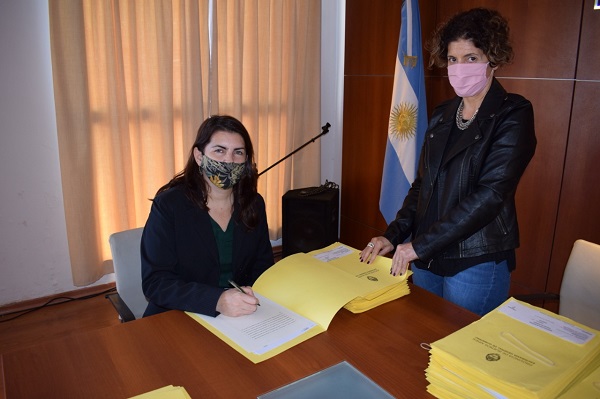 La Escribana General de Gobierno, Paula Sidoti, recibió a la intendenta de Moreno, Mariel Fernández, para firmar 189 escrituras sociales que beneficiaran a familias de ese distrito y rubricaron la adquisición de otros inmuebles para la comuna.