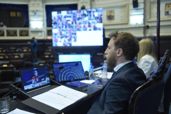 La Cámara de Diputados de la provincia de Buenos Aires realizó una sesión ordinaria repitiendo la modalidad instrumentada desde el inicio de pandemia, con el presidente del cuerpo, Federico Otermín, junto a los presidentes de bloque y las autoridades de la Cámara en el recinto, y los demás diputados y diputadas participando de manera remota.