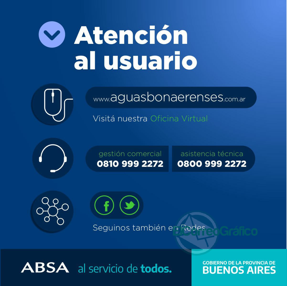 ABSA informa que se encuentra disponible la oficina virtual dentro de la página web www.aguasbonaerenses.com.ar, donde se puede realizar trámites y gestiones comerciales en forma online.