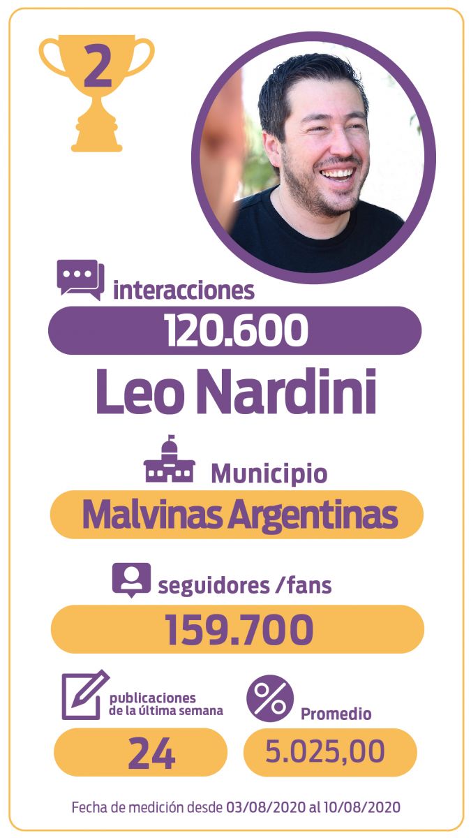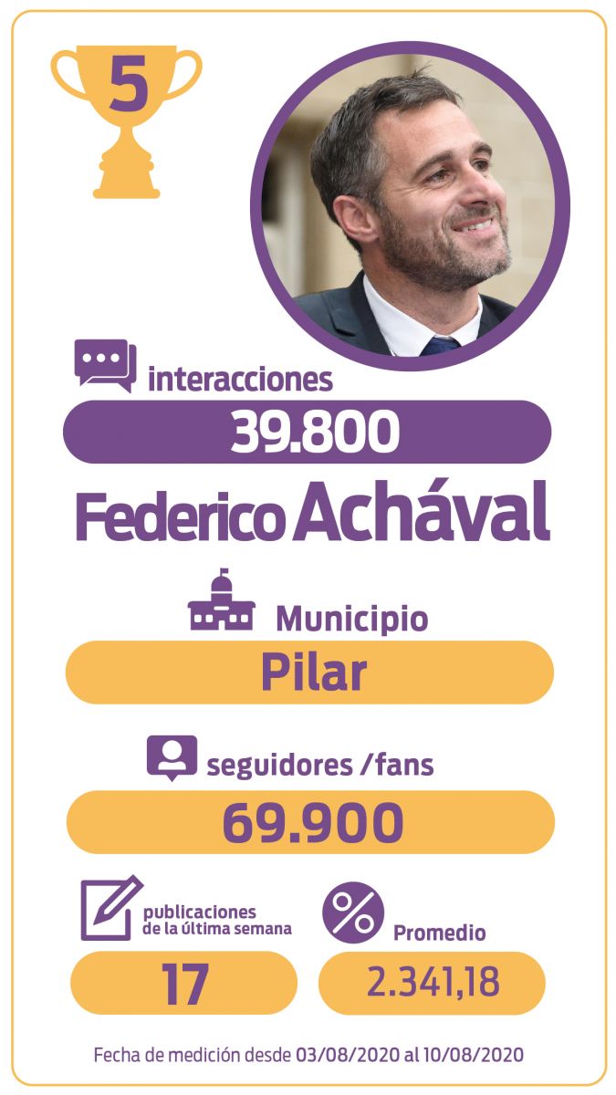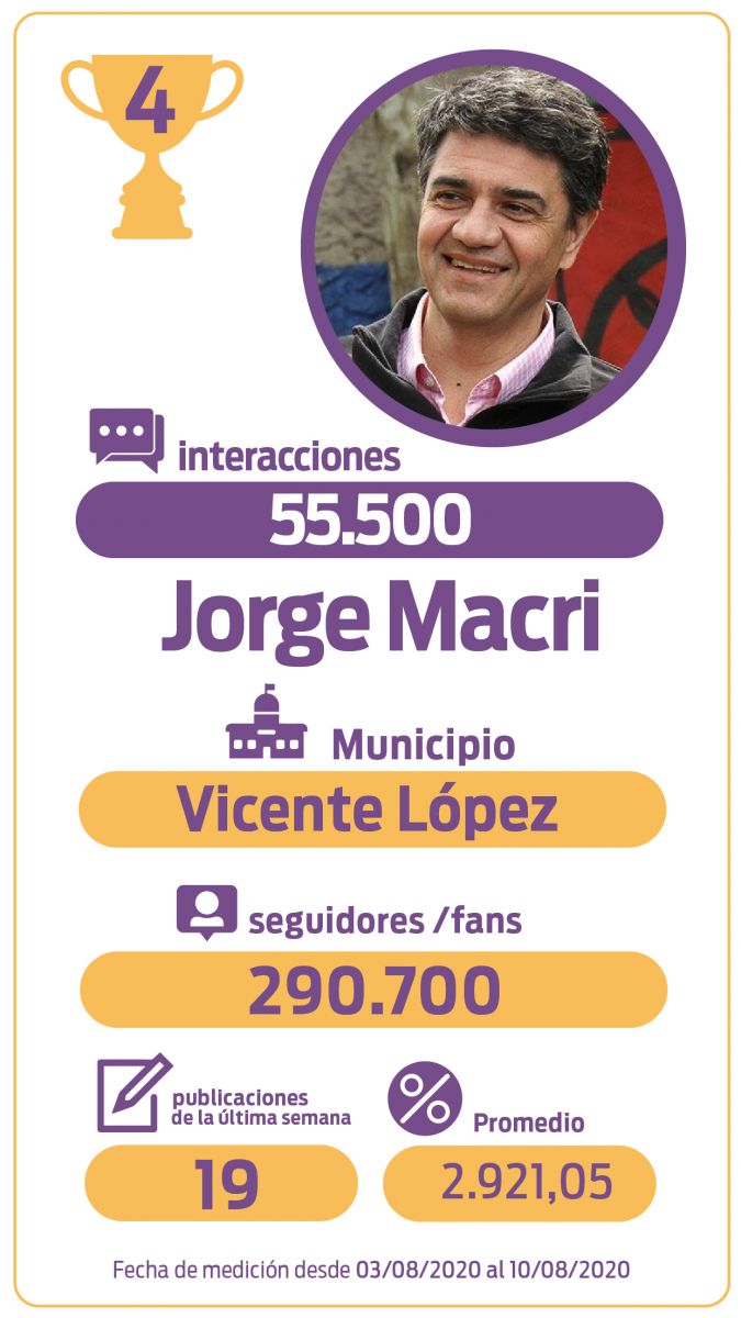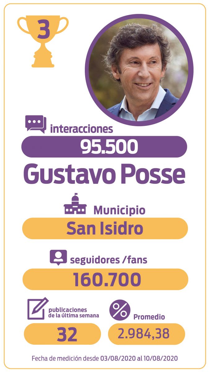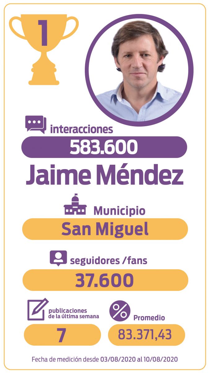 El podio se lo lleva el intendente de San Miguel, Jaime Méndez, seguido por Leo Nardini de Malvinas Argentinas y Jorge Macri en Vicente López. El informe muestra a los mandatarios municipales que obtuvieron mayor interacción en sus redes sociales teniendo en cuenta cantidad de seguidores y publicaciones.