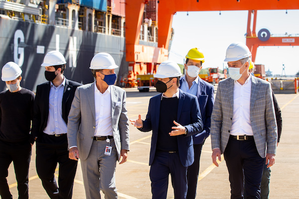 El gobernador de la provincia de Buenos Aires, Axel Kicillof, recibió este martes en la terminal de Berisso al buque que realiza por primera vez un servicio de importación y exportación desde el Puerto de La Plata con destino Asia. Estuvo acompañado por el intendente de Berisso, Fabián Cagliardi, el ministro de Producción, Ciencia e Innovación Tecnológica, Augusto Costa, y el presidente de la empresa operadora de la terminal de contenedores TecPlata, Bruno Porchietto.