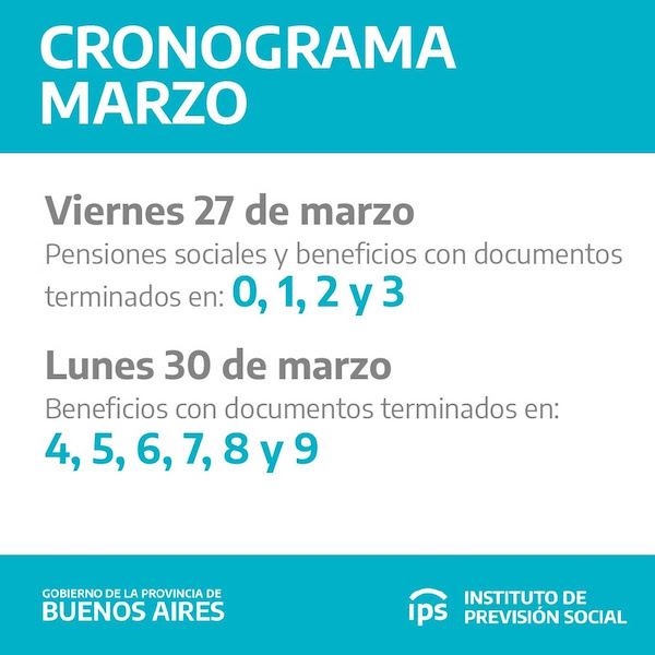 El Instituto de Previsión Social Bonaerense (IPS) informa que los jubilados y pensionados de la Provincia de Buenos Aires percibirán los haberes correspondientes al mes de febrero entre los días viernes 27 y lunes 30, según cronograma que se detalla a continuación