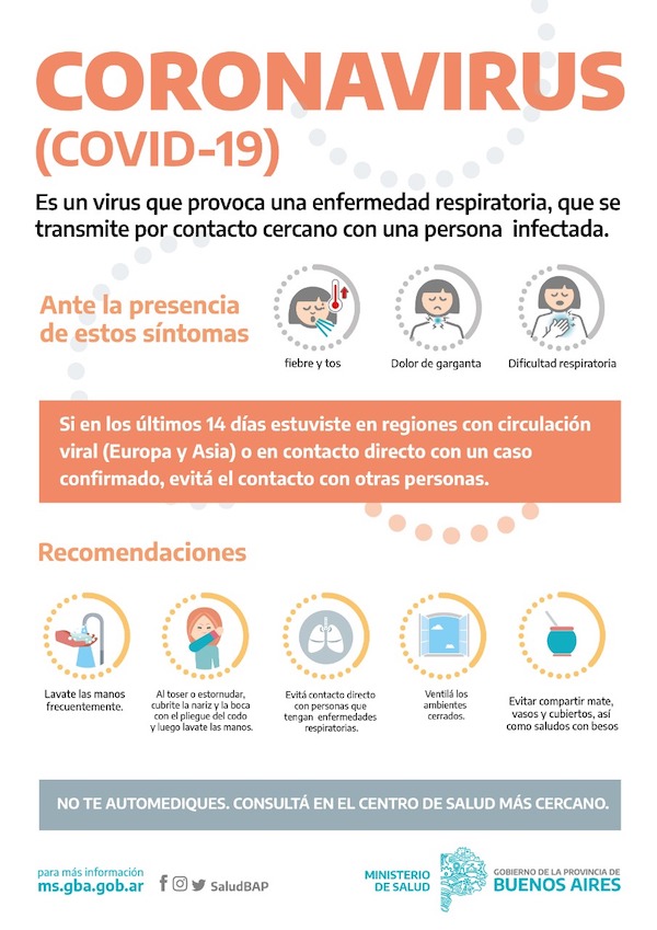 Frente al reporte de casos de pacientes infectados por Coronavirus en el país, el ministerio de Salud bonaerense difundió un protocolo actualizado para la detección y manejo de potenciales pacientes en establecimientos de salud públicos y privados, y una serie de recomendaciones para organismos del Estado y para la comunidad.